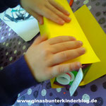 Beklebt den Karton mit einem farbigen A4 Blatt und streicht es fest.